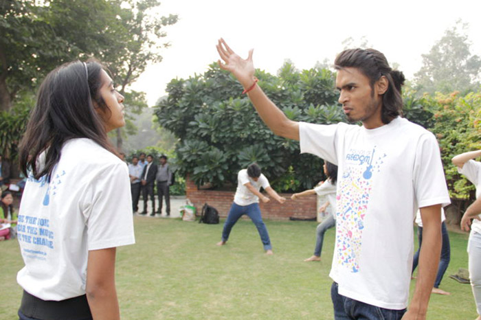 In 2014, as a part of College Outreach, students from various colleges across Delhi participated in theatre and music workshops held at Sri Venkateswara College, Delhi University. These workshops centered around Arts as a means of advocacy and spreading awareness on ‘Human Rights’. We invited college societies to work together on theme based performances with facilitators such as Taru Dalmia a.k.a Delhi Sultanate, Chayan Adhikari and Ujwal Nagar from Delhi fusion band Advaita, Pramada Menon (a dynamic gender activist and performer), Gilles Chuyen (choreographer and theatre performer). Our facilitators worked with students from different colleges to come up with original songs and nukkad naataks based on ‘Human Rights’. These nukakd naataks were then performed across the city to raise awareness about these theme as well as the concert. The music groups composed songs based on the theme, which were recorded and compiled into an online downloadable album: The Sounds of Freedom- a Beginning.